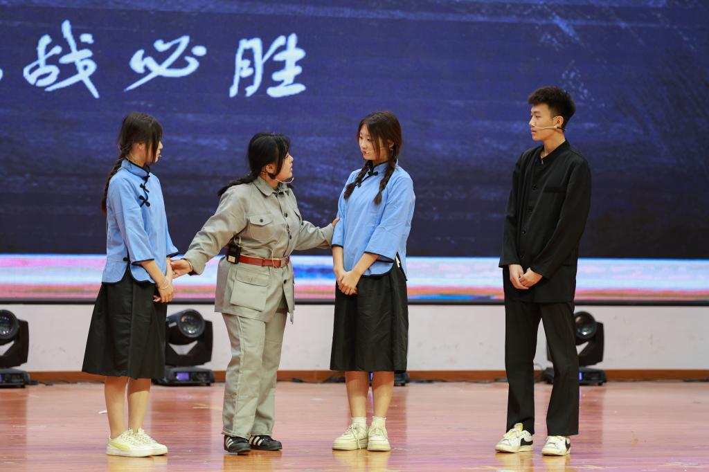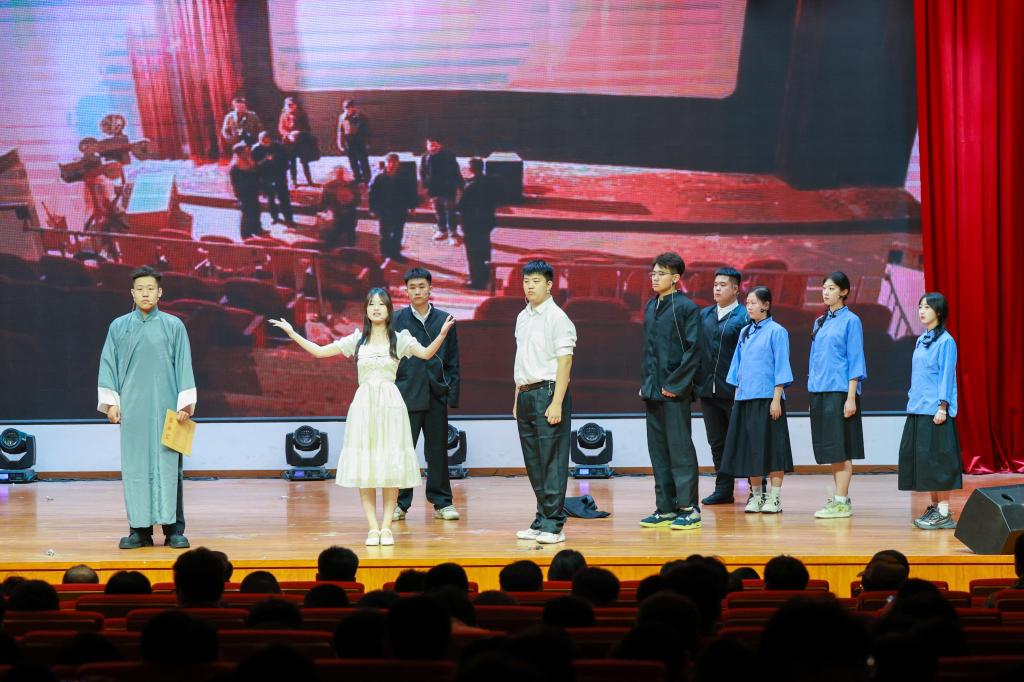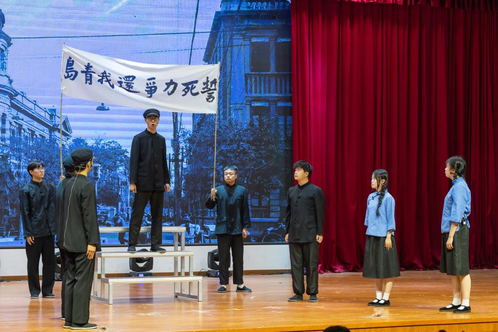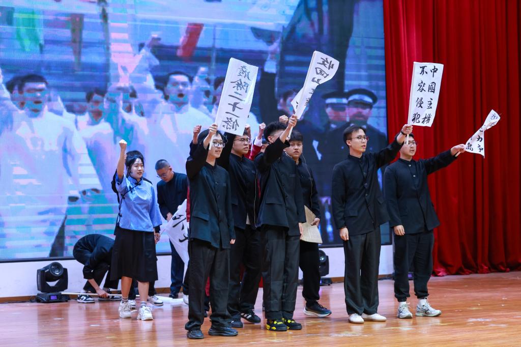 7个参赛学院以独具匠心的策划、精心设计的编排为现场师生呈现了一场精彩纷呈的演出。参加此次演出的选手,都是利用课余时间精心准备,创作剧本、挑选演员、感悟角色、反复排演、背景制作、服装挑选……,同学们认真对待、全力以赴,用精彩的表演生动地再现了热血青年爱国游行、奔赴战场保家卫国等一个个震撼人心的画面。