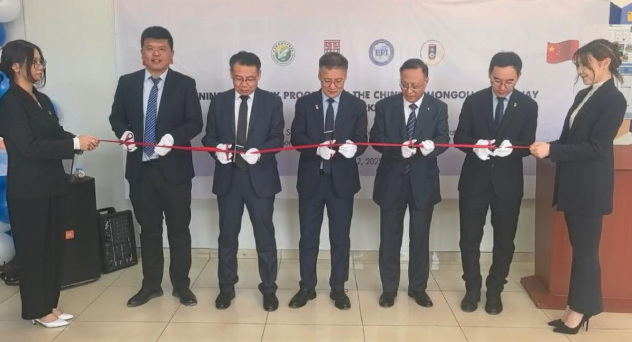 参会领导集体为中蒙铁路“墨子工坊”揭牌剪彩,共同见证这一极具重大意义的历史时刻。