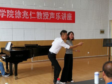 在四位学生演唱完毕,徐教授又对声乐演唱中经常遇到的问题进行讲解、分析。讲学结束后,排练厅响起了经久不息的掌声,三个小时的声乐讲座落下了帷幕。