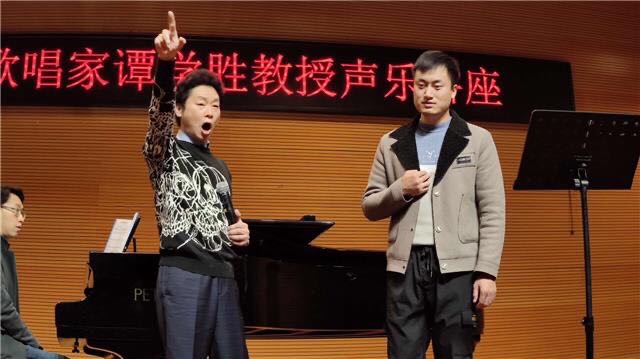 声乐讲座以民族男高音教学为主题,总结归纳了如:“瞪眼气自来”的演唱提气方法、演唱管道建立的九个力量知识点、“作品决定唱法 语言决定风格”的重要理念等,谭学胜教授采取边练边讲、边学边唱的互动形式,形象生动地为观众讲授了科学的发声方法、正确的声音观念以及实用的歌唱技巧,让在场的观众纷纷受益匪浅。