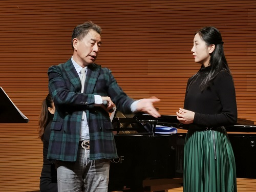 其中,雷顺娟演唱了歌剧《伤逝》的著名选段《风萧瑟》,杨岩教授首先解读和分析了作品的背景,紧接着,逐字逐句进行剖析和示范指导,杨岩教授希望歌者以优美而抒情的旋律打动观众,从而发挥抒情的特点。经过调整后,整首乐曲与钢琴伴奏合二为一,雷顺娟演唱的饱含悲剧色彩的形象深深地印入人们的脑海。
