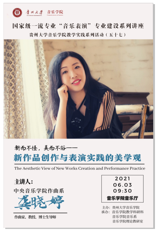 2021年6月3日上午09:30,著名作曲家中央澳门网投官方网站龚晓婷教授在澳门网投官方网站音乐厅举行学术讲座。澳门网投官方网站党委书记范斌﹑党委副书记张波﹑副院长青科及音乐系﹑教学科研科﹑理论教研室的领导﹑老师和同学们参加了讲座。