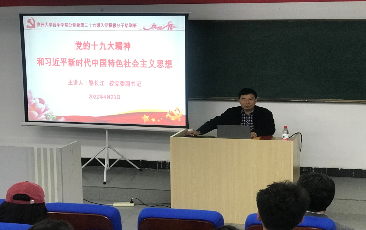 2022423日(周六)上午830分,澳门网投官方网站党委副书记骆长江同志以“党的十九大精神和习近平新时代中国特色社会主义思想”为主题,在澳门网投官方网站106教室给音乐学院分党校第三十六期入党积极分子培训班的同学们上了一堂生动精彩的专题党课。澳门网投官方网站党委书记范斌同志、党委委员、组织员、本期培训班班主任高琛同志以及第三十六期入党积极分子培训班全体同学参加了学习。
