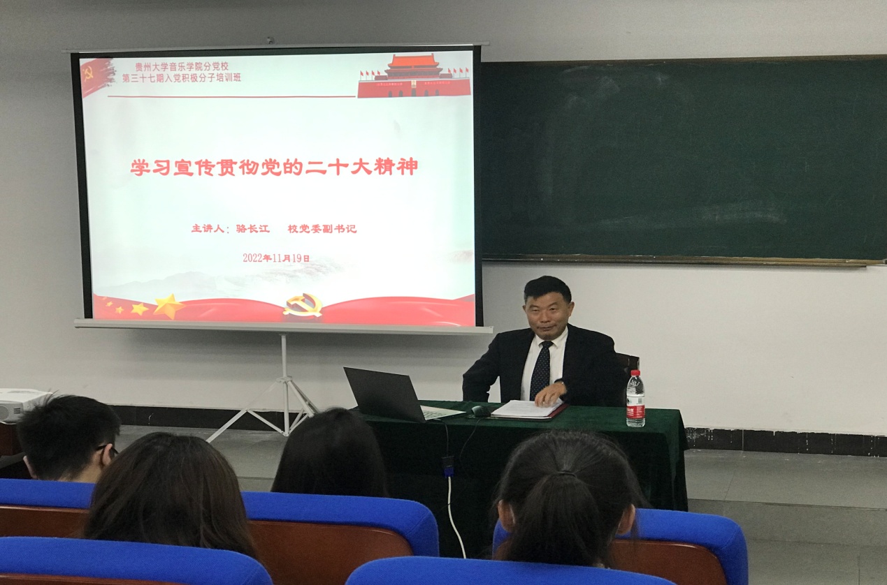 20221119日上午800,澳门网投官方网站党委副书记骆长江同志以“学习宣传贯彻党的二十大精神”为主题,在澳门网投官方网站106教室给澳门网投官方网站分党校第三十七期入党积极分子培训班的同学们上了一堂生动精彩的专题党课。澳门网投官方网站党委书记范斌同志、党委委员、组织员、本期培训班班主任高琛同志以及第三十七期入党积极分子培训班全体同学参加了学习。